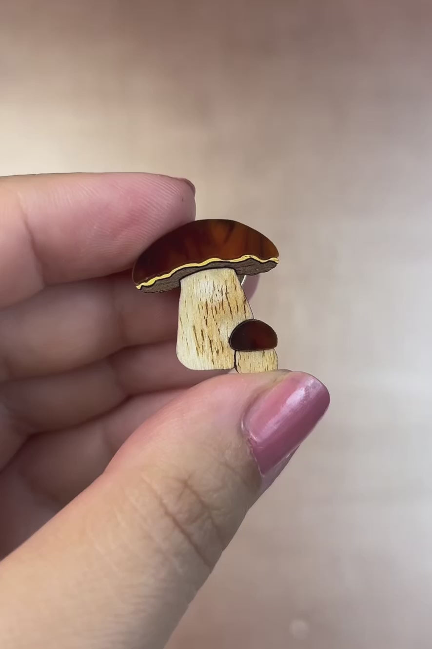 A wooden brooch featuring a nature-inspired design of two brown-capped mushrooms, one large and one small, placed on white paper with dried beige plants in the background. Showcases handcrafted quality and resembles a King Bolete Mushroom Pin.