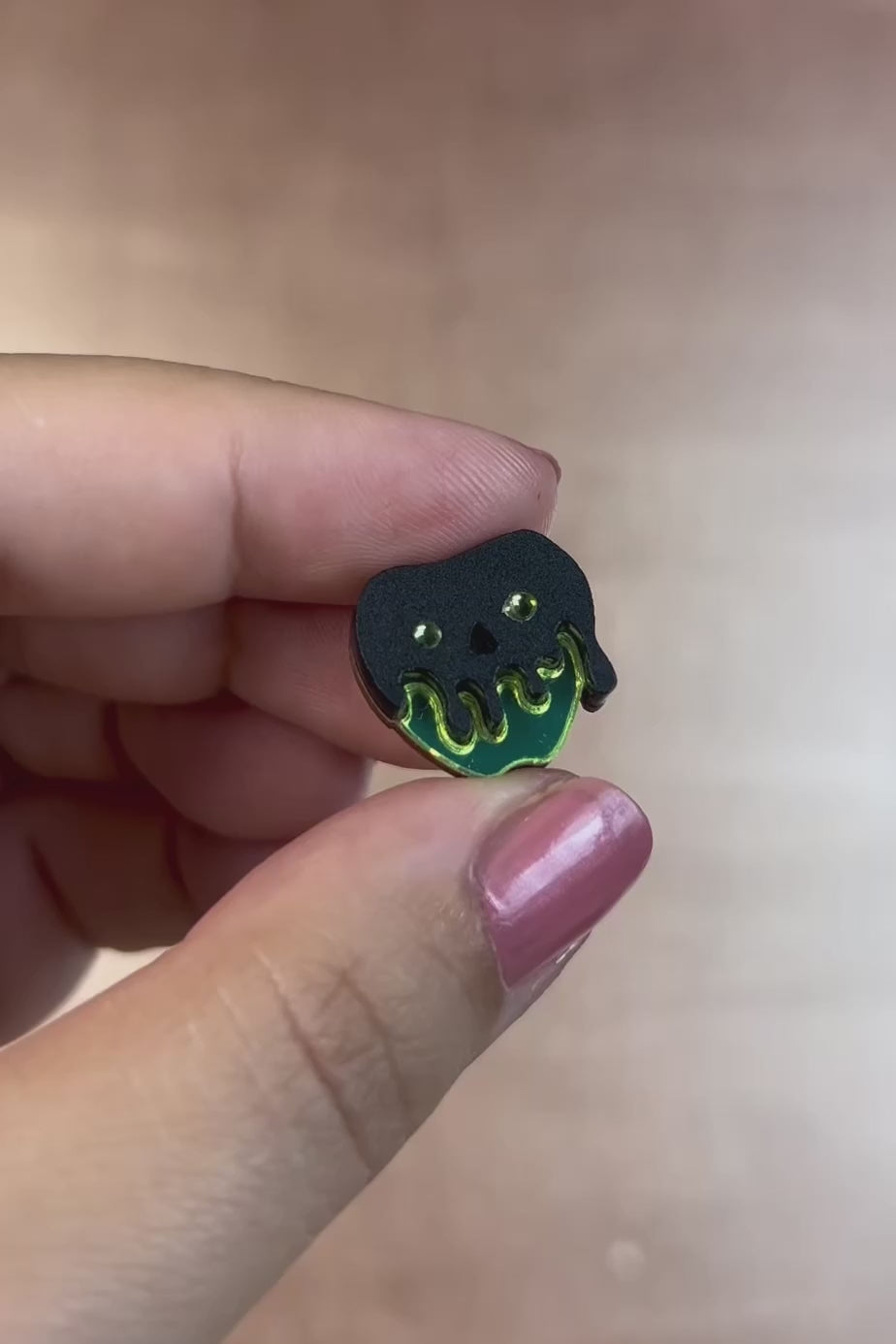 Tento pin zobrazuje jedovaté zelené jablko obalené hrubou vrstvou čiernej hmoty. Oči vyrobené z trblietavých zelených kamienkov prenikajú strašidelným leskom a dodávajú im extra nádych očarujúceho šarmu.