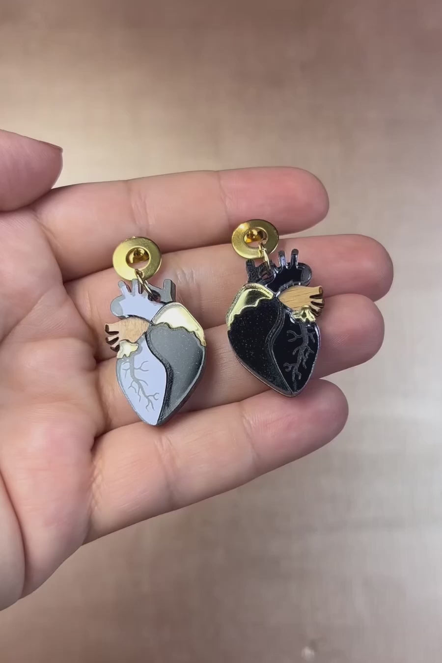 A pair of Anatomical Heart Earrings with gold accents and black, grey, and wood-toned details adds a touch of gothic flair, displayed on a white fabric background—perfect for lovers of unique handcrafted accessories.