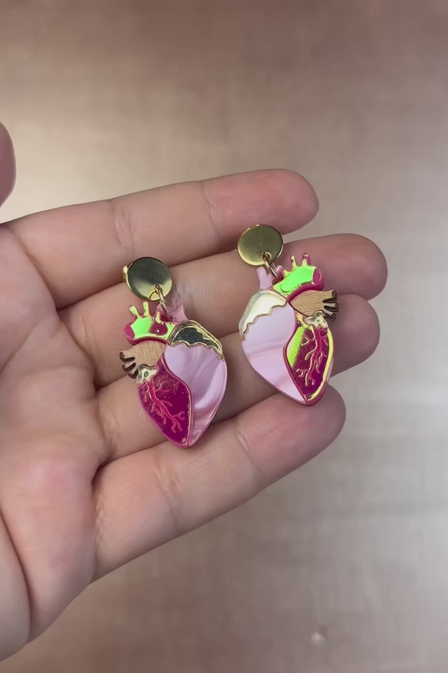 Objavte naše náušnice v tvare anatomického srdca, vyrobené z holografického, mramorovaného ružového a zlatého akrylu. Ľahké, odolné a ideálne pre výrazný a jedinečný štýl.
