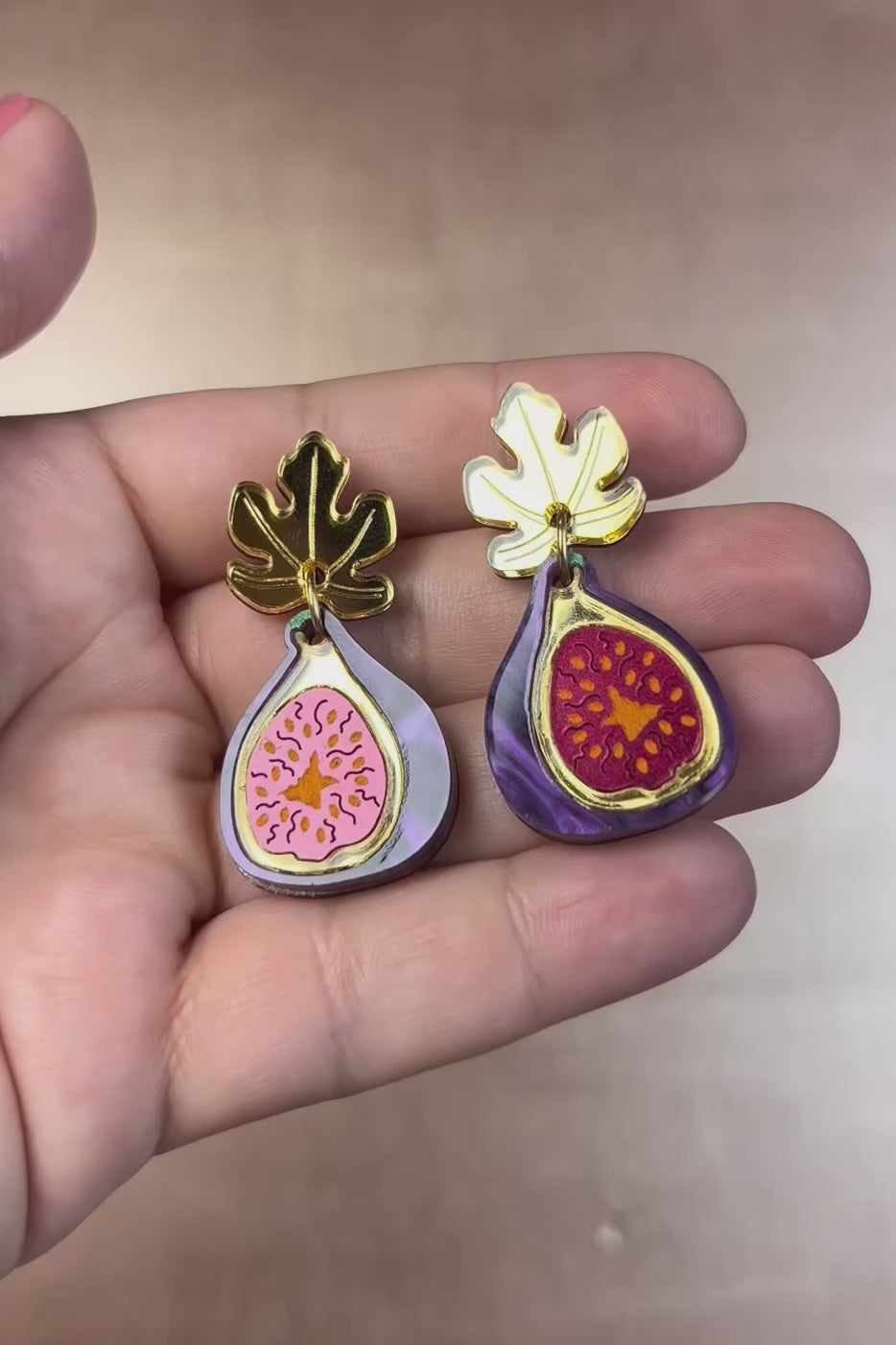 Handcrafted Fig Earrings shaped like figs with gold mirror leaves, featuring purple, pink, and gold details, displayed on a white and pink fabric background.