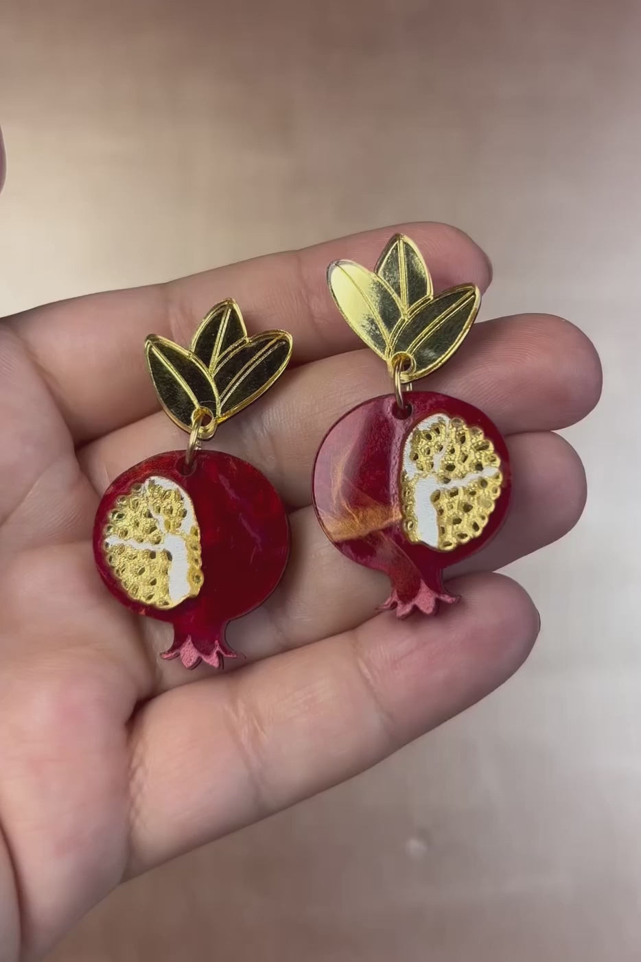 - Unikátny dizajn: Stredne veľké visiace náušnice s výrazným príveskom z červeného granátového jablka s odhalenými zlatými semienkami, ktoré sú ozdobené žiarivými zlatými zrkadlovými listami.