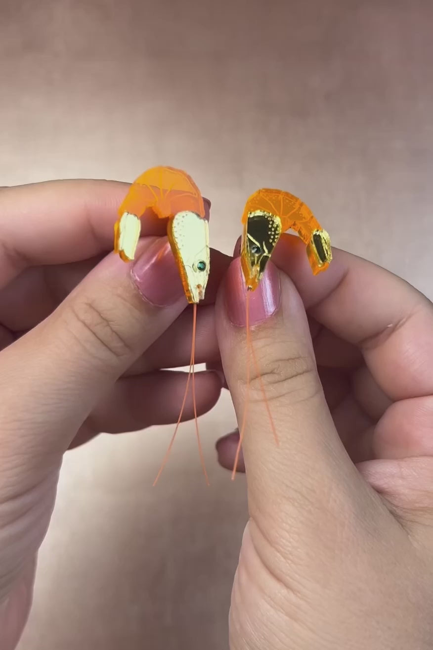Two neon orange Shrimp Stud earrings, shaped like shrimp with long antennae crossing in the center, are positioned facing each other on a turquoise background. Subtle emerald rhinestones add a touch of sparkle to their playful design.