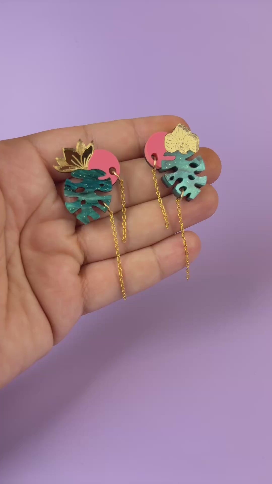 • Unikátny tropický dizajn: Náušnice Tropicana, vyrezané laserom z vysoko kvalitného akrylového skla, zdobia žiarivé smaragdové listy monstery, oslnivé zlaté zrkadlové kvety a koralový slnečný kruh, ktorý evokuje krásu západu slnka.