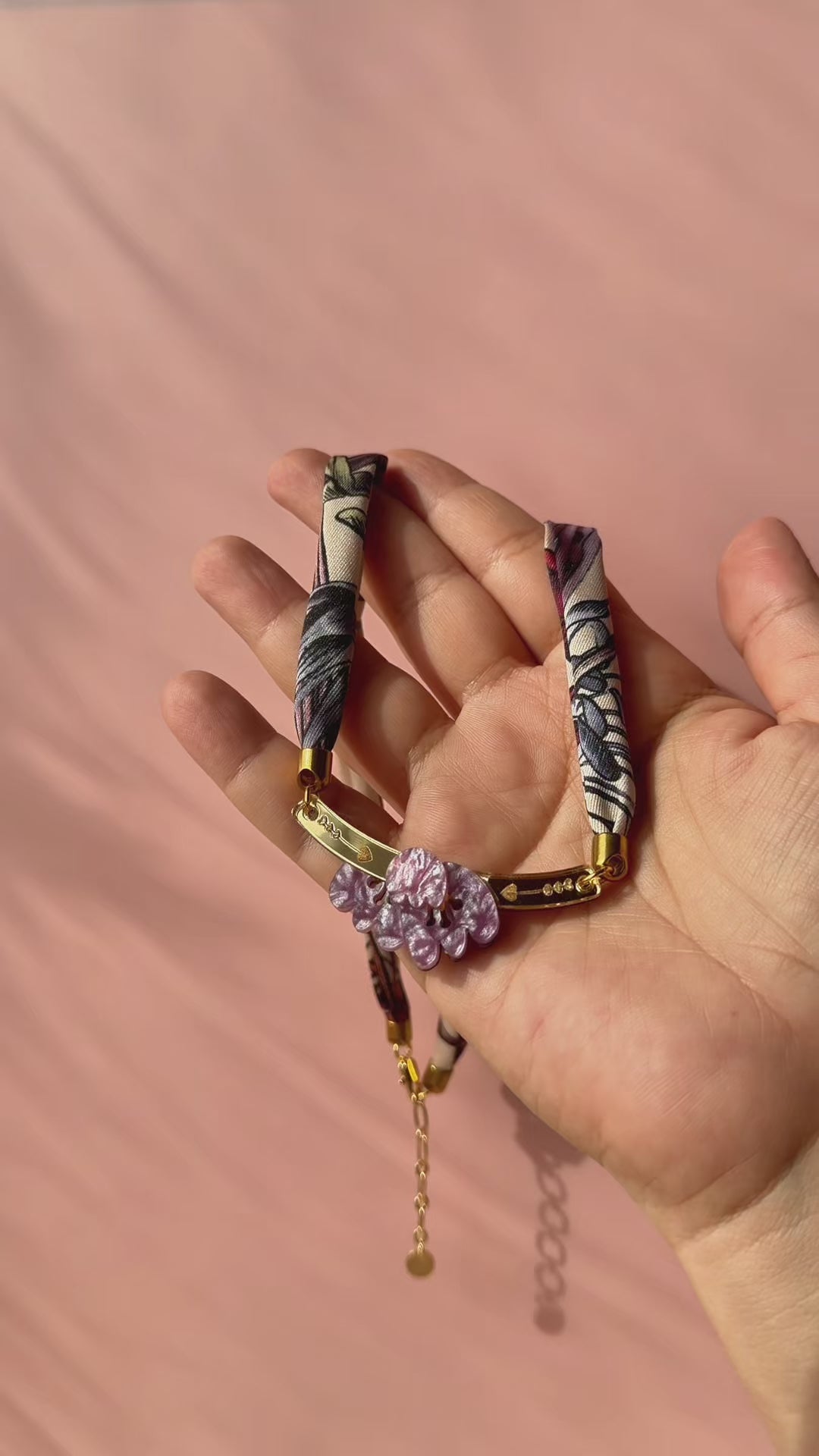 Ručne vyrobený náhrdelník, ktorý jemne leží pri kľúčnych kostiach, spája hodvábne potlačenú šatku s akrylovým tulipánom. Umelecký, nositeľný a skutočne jedinečný.