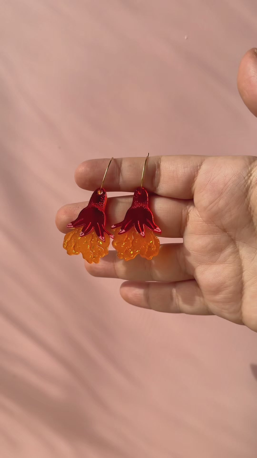Niektoré kvety nešepkajú — horia. Náušnice Kvet Granátovníka vychádzajú z dramatického kvetu granátového jablka v plnom letnom rozpuku: výrazné vrstvy sýtej červenej a žeravo oranžovej zachytávajú svetlo a nepustia ho. Laserom vyrezávaný akryl žiari drobnými trblietavými flitrami, ktoré sa pri pohybe jemne ligocú, a je zavesený na subtílnych pozlátených kruhoch, ktoré nechávajú vyniknúť to najdôležitejšie - samotný kvet.
