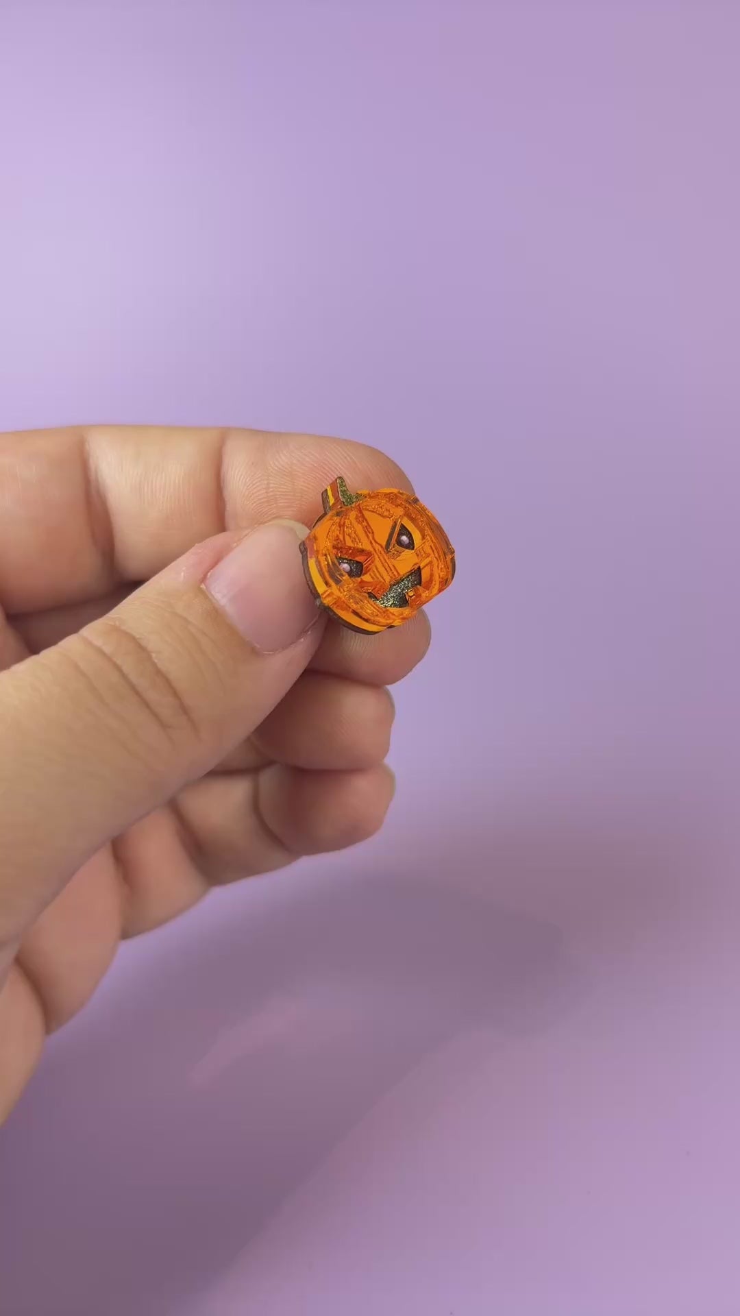 A small, shiny, orange Spooky Pumpkin Pin with a green stem and a mischievous expression sits on a plain light purple background, adding handcrafted Halloween charm to any décor.