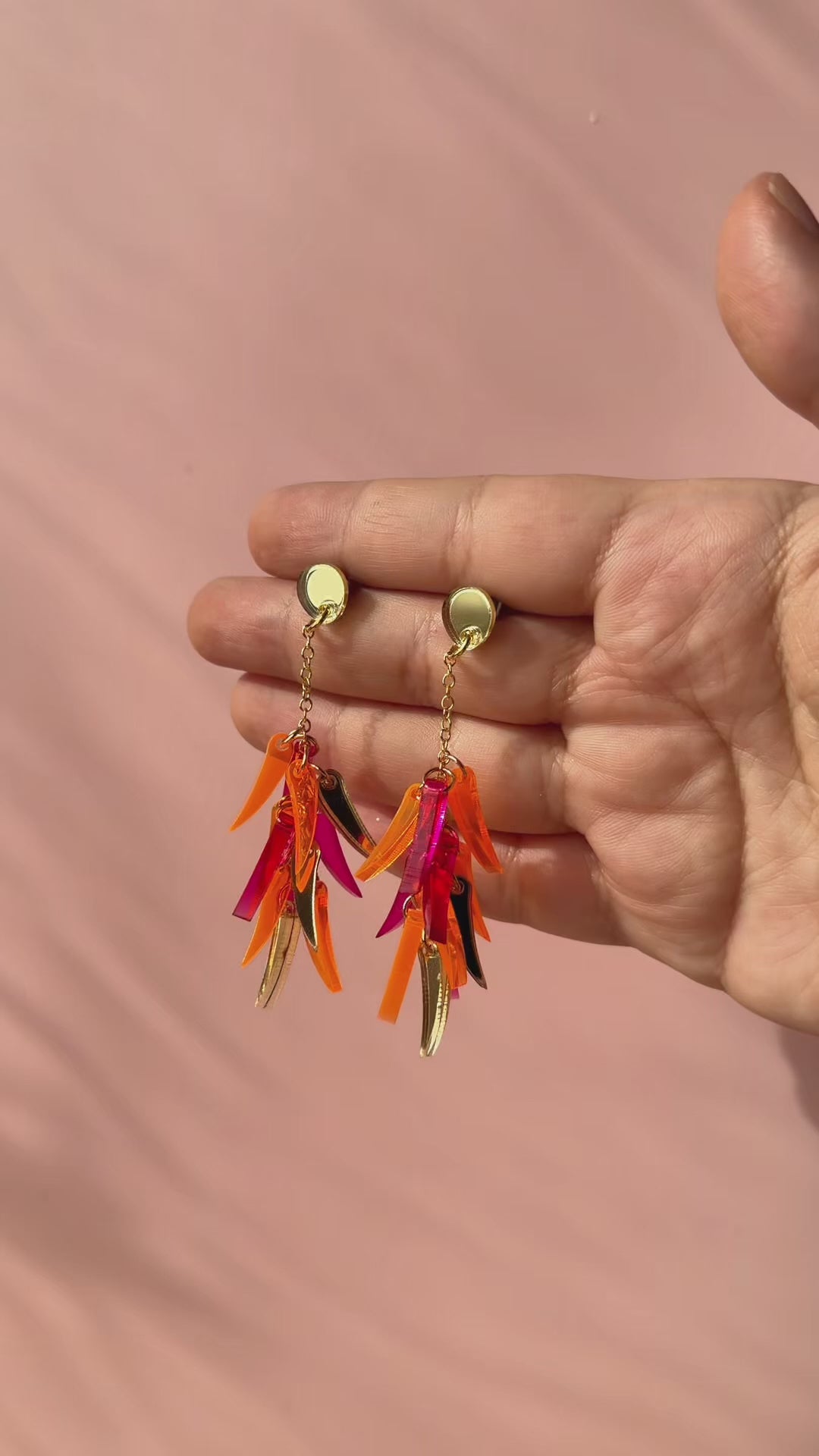 Dajte si ich raz a pochopíte, prečo sa za vami všetci otáčajú. Náušnice Tuft sú kaskáda zahnutých akrylových lístkov visiacich na jemnej pozlátenej retiazke, ktoré sa voľne pohybujú s každým krokom ako drobné palmové vetvičky zachytené teplým vánkom. Vyberte si z jednej zo štyroch výrazných osobností: mramorovaná čierna pre divoký, výrazný vzhľad; priehľadná biela so zlatými žilkami pre nenápadný lesk; tropic v sýto oranžovej a fuchsiovej pre plnohodnotný farebný kontrast; a lagoon - zmes matnej mätovej a trblietavej tyrkysovej, ktorá vyzerá, akoby bola vylovená priamo z morského dna.