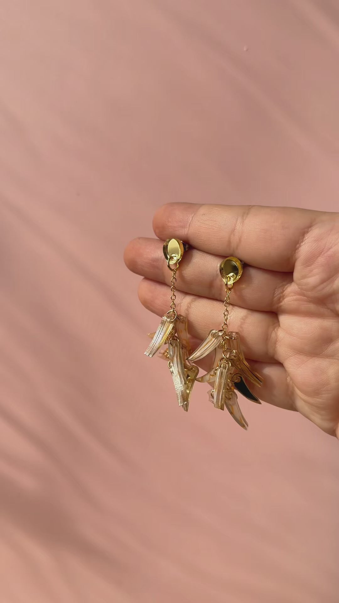 Dajte si ich raz a pochopíte, prečo sa za vami všetci otáčajú. Náušnice Tuft sú kaskáda zahnutých akrylových lístkov visiacich na jemnej pozlátenej retiazke, ktoré sa voľne pohybujú s každým krokom ako drobné palmové vetvičky zachytené teplým vánkom. Vyberte si z jednej zo štyroch výrazných osobností: mramorovaná čierna pre divoký, výrazný vzhľad; priehľadná biela so zlatými žilkami pre nenápadný lesk; tropic v sýto oranžovej a fuchsiovej pre plnohodnotný farebný kontrast; a lagoon - zmes matnej mätovej a trblietavej tyrkysovej, ktorá vyzerá, akoby bola vylovená priamo z morského dna.